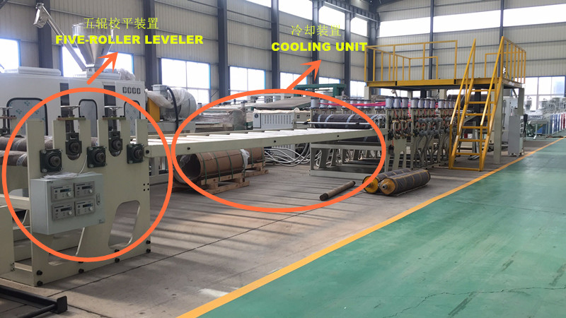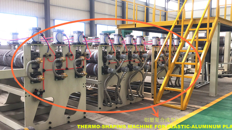 青島東方之星的一套完整的PE鋁塑板生產(chǎn)線由SJ150×33單螺桿擠出機、復(fù)合模頭、三輥壓光機、雙面鋁卷放料架、雙輥熱復(fù)合機、八輥熱復(fù)合機、六輥冷卻導(dǎo)輥架、覆膜機、四輥牽引機和切割機等設(shè)備組成,通過PLC系統(tǒng)實現(xiàn)整線智能化控制。